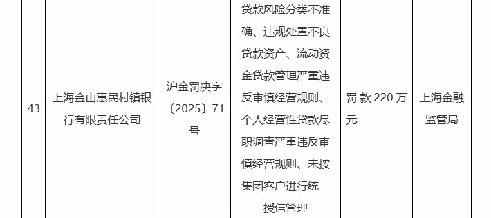 上海金山惠民村镇银行有限责任公司因贷款风险分类不准确、违规处置不良贷款资产、流动资金贷款管理严重违反审慎经营规则、个人经营性贷款尽职调查严重违反审慎经营规则、未按集团客户进行统一授信管理,被罚款220万元。时任该行行长助理、风险执行官于江被警告并罚款5万元。时任该行副行长徐水林被警告并罚款5万元。