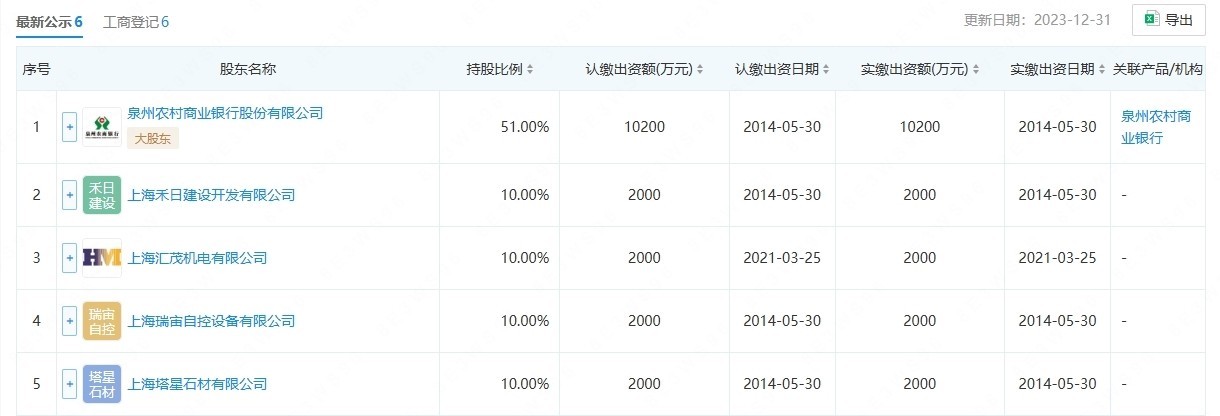 公开信息显示,上海青浦惠金村镇银行成立于2014年12月,注册资本2亿元,第一大股东为泉州农商银行,认缴出资额1.02亿元,持股比例51%。