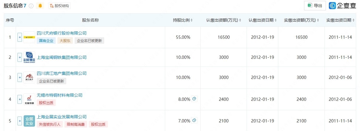 公开信息显示,上海金山惠民村镇银行第一大股东为四川天府银行,认缴出资额1.65亿元,持股比例为55%。
